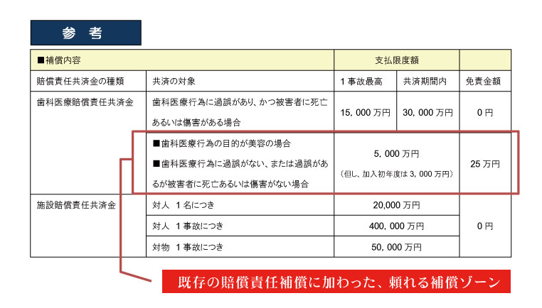※共済会がご用意している補償は、歯科医師賠償責任保険が持つ補償機能に加えて次のサービスが備わっています。 ①最大補償額15000万円/事故 ②歯科医師だけではなく、スタッフ全員を補償 ③美容分野、クレームレベルの事案も対象とし、補償(次頁表を参照) ④共済会顧問弁護士(歯科医師兼弁護士も含む)による事案解決サポート 共済会がご提供する補償は、「金銭(=保険金)」だけではなく、トラブルの発生前の相談から解決までの一切合財の総合サポート力が特長です。私たちは先生方へトラブルに振り回されることなく治療に専念できる環境をお届けできるよう、最大限の努力を払います。